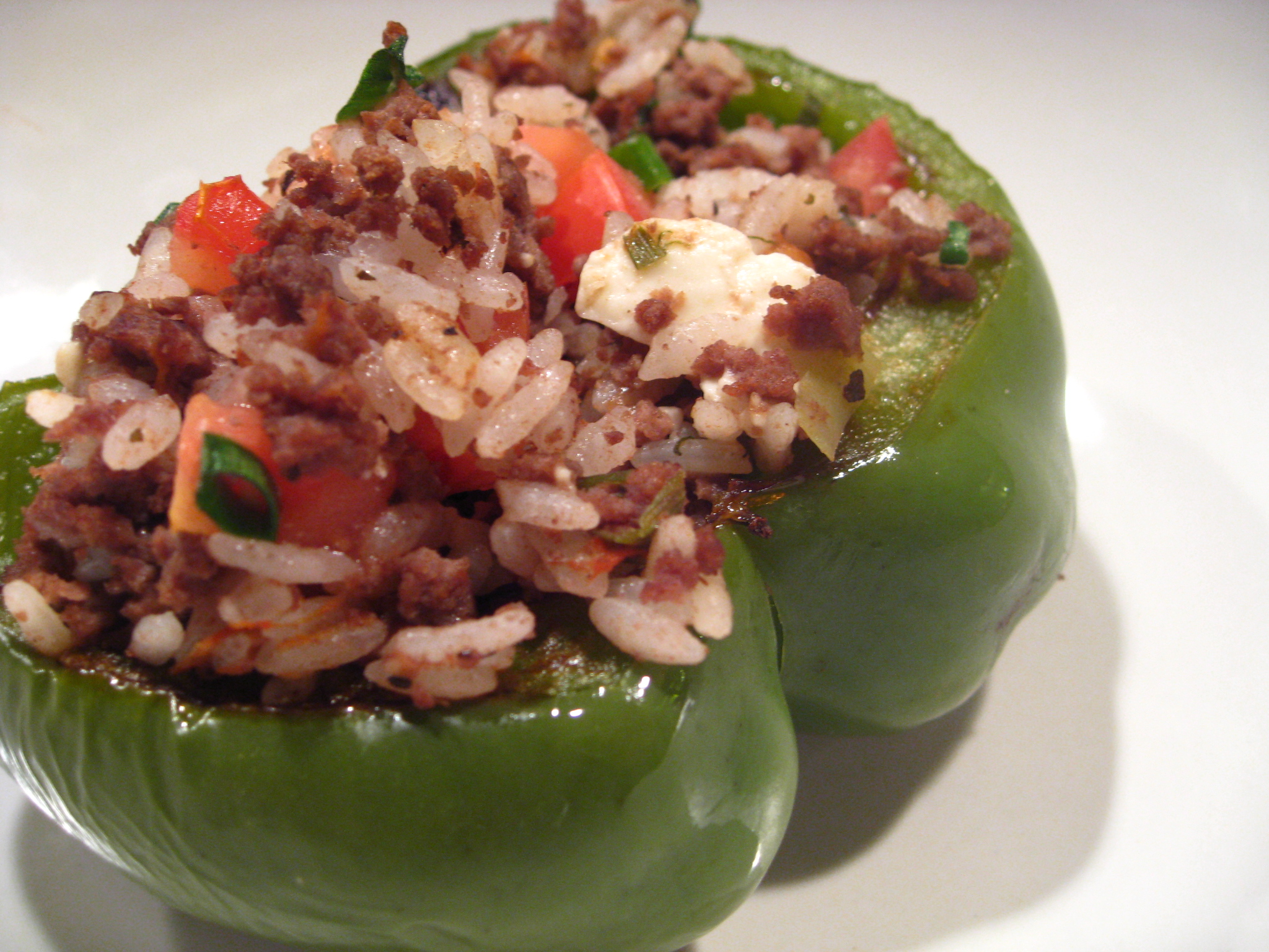 - Spoon in the cooked rice, tomatoes, and the remainder of the green onions and stir until heated through. Remove from heat, mix in the feta cheese, and spoon the mixture into the pepper halves.