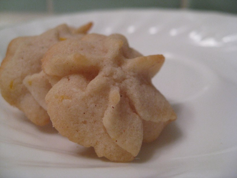 This cookie is really light and delicious and pretty easy to make as well. I don’t own a cookie press so I improvised with a pastry bag and my largest star tip. The snowflakes were a little hard to form since the dough was pretty thick and sticky, but I think they came out pretty well! I may have to invest in a cookie press and try these again, though!