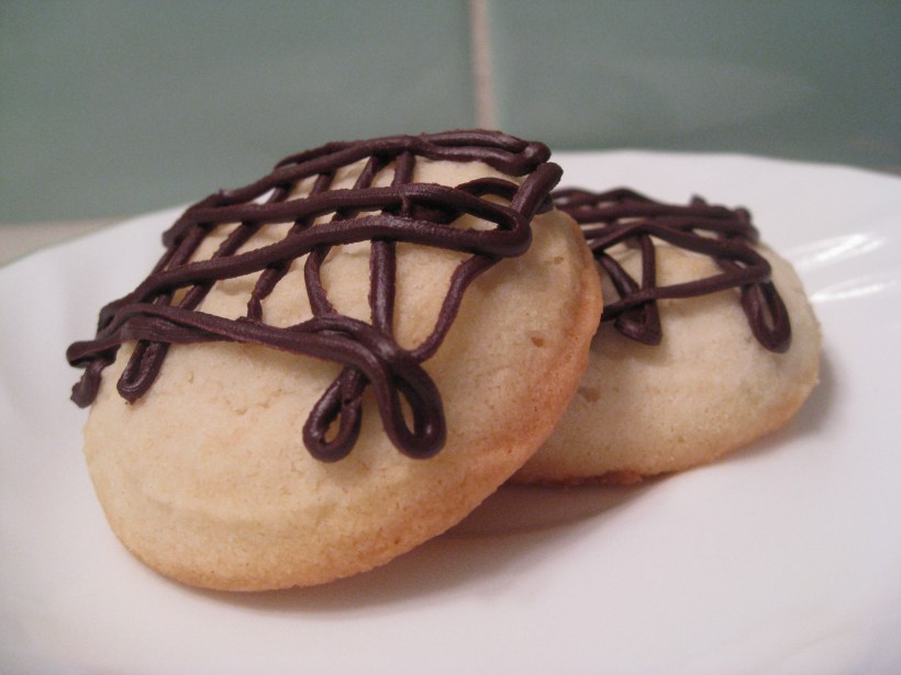 I decided to drizzle my cookies with some chocolate. I melted 1 cup of chocolate chips with 2 tablespoons of butter and used a pastry bag to pipe the drizzle on top.