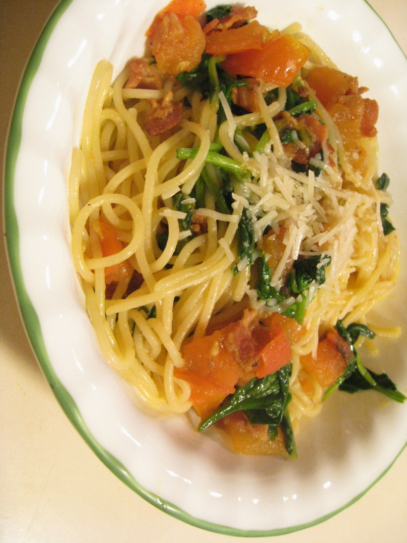 - Add in tomatoes and cook until warmed. Add in spinach and cook until just wilted. Toss with cooked spaghetti until well incorporated. Serve immediately with a sprinkle of Parmesan cheese on top.