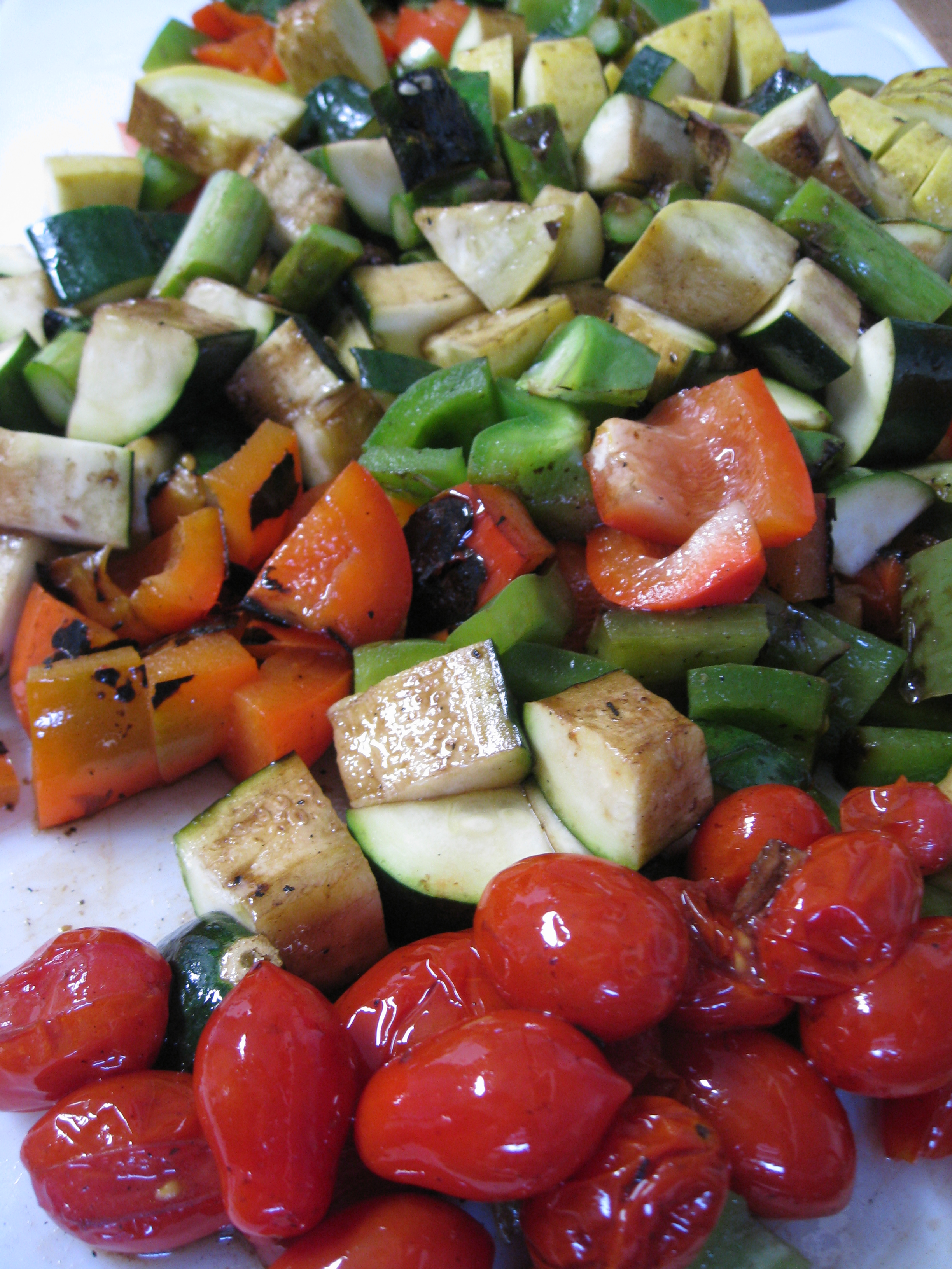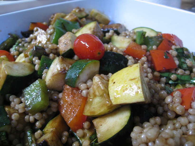 - Cut grilled vegetables into 1/2 – 1 inch pieces and place into serving bowl. Mix couscous and vegetables together with basil and vinaigrette. Serve immediately.