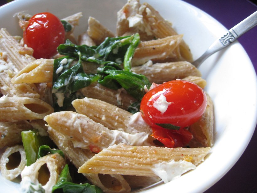 This dish is super filling and easy to make. I mean, what could be easier than cooking up a dish in less than 10 minutes? Not to mention it only used 2 pots (and one colander). Ever since it warmed up I’ve been craving dishes with fresh ingredients. I can’t wait to make this again with fresh tomatoes from the garden!