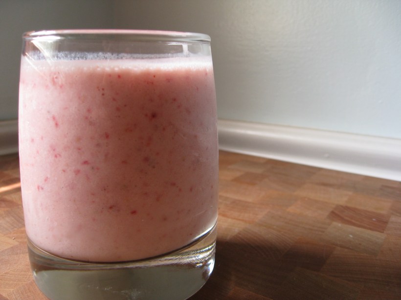 For the first time in my life, I made a smoothie without any ice or frozen fruit. Why? We didn’t have any. I did however, have some very ripe strawberries that I needed to use up. I threw this together and it was light and refreshing, even though it wasn’t ice-cold. Feel free to use frozen fruit or toss in some ice to up the chill factor.