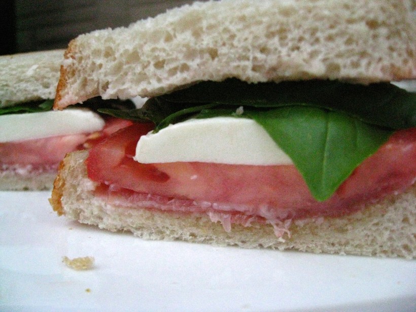 - On three slices of bread, layer on prosciutto, mozzarella, tomato, and basil. Place second slice of bread on top.