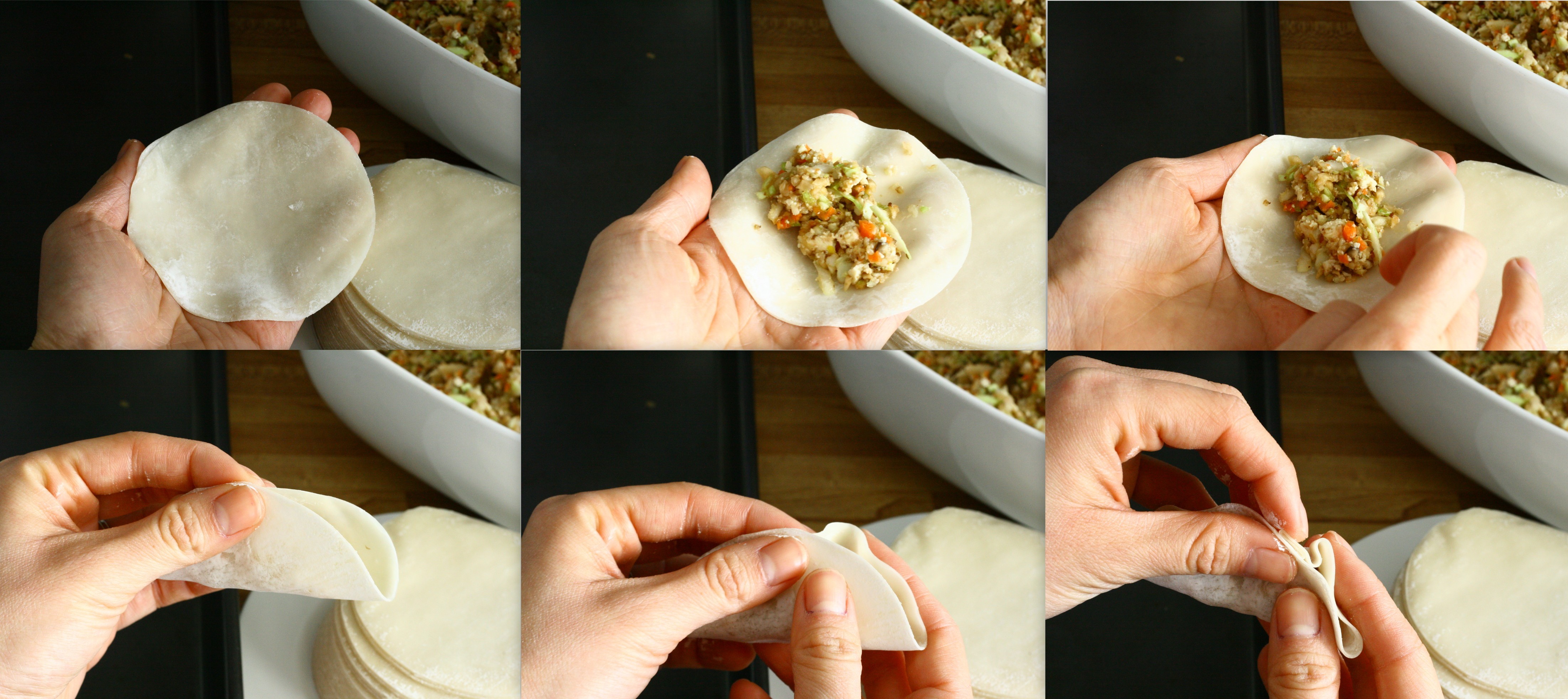 1) take a wrapper  2) 1 tablespoon filling  3) wet edges with water