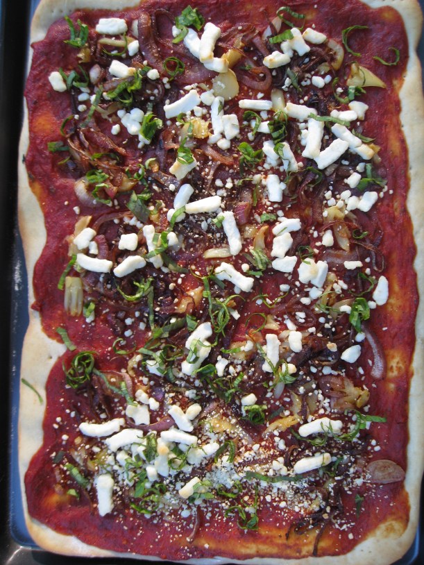 I seriously don’t even know how to explain the sweetness of the pizza sauce paired with the tangy goat cheese and sweet, caramelized onions… so, just try it for yourself!