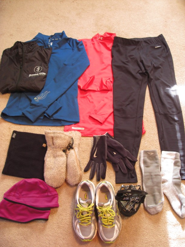 I quickly searched the world wide web for guidance on what to wear. I normally peek at the Runner’s World What to Wear Running App, but that never seems to work out for me. And guess what? There aren’t a whole lot of people out there talking about running in the cold. Some blogs talked about running in the “cold” where cold = 30°F. Pfft! To me, that’s nice running weather.