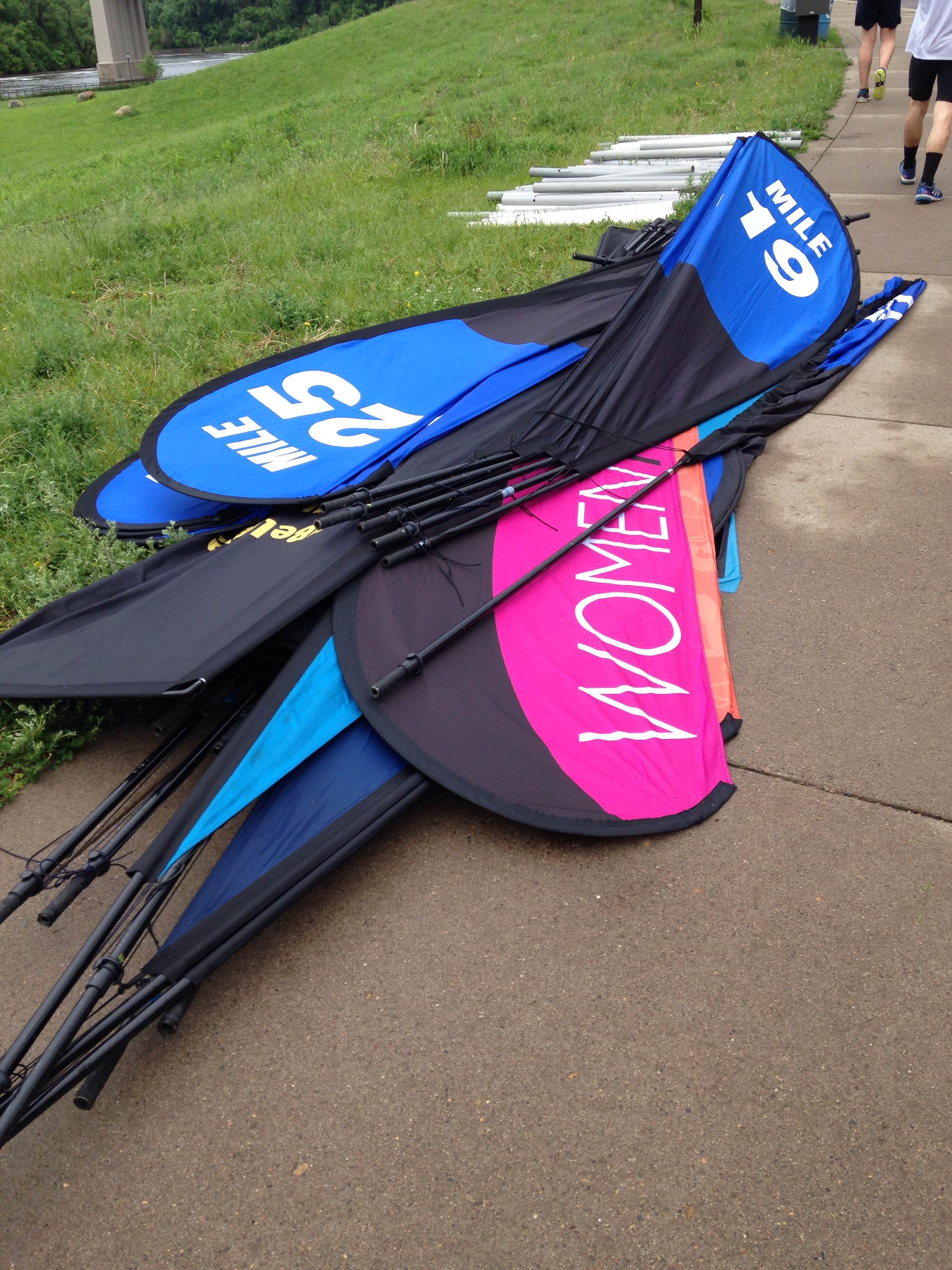 The whole story: A group of seven of us traveled to Minneapolis on Saturday for the race. Three runners (Adam, the birthday boy, and I planned on running the full, Ash the half) and four amazing cheerleaders. As soon as we crossed the state line, the rain started. It wasn’t bad and we hoped that the rain that was predicted for race day was just coming in early. The race expo was a bit unorganized and not very helpful at all. I was surprised to find out that they did not have any course maps available at the expo and the gal at the booth told us instead to just look at it online. Sure, that might have worked… had their PDF been readable. You could see the general outline of the course, but the street names were indiscernible. I mean, how the heck is something like this supposed to be useful to people who aren’t familiar with the area?